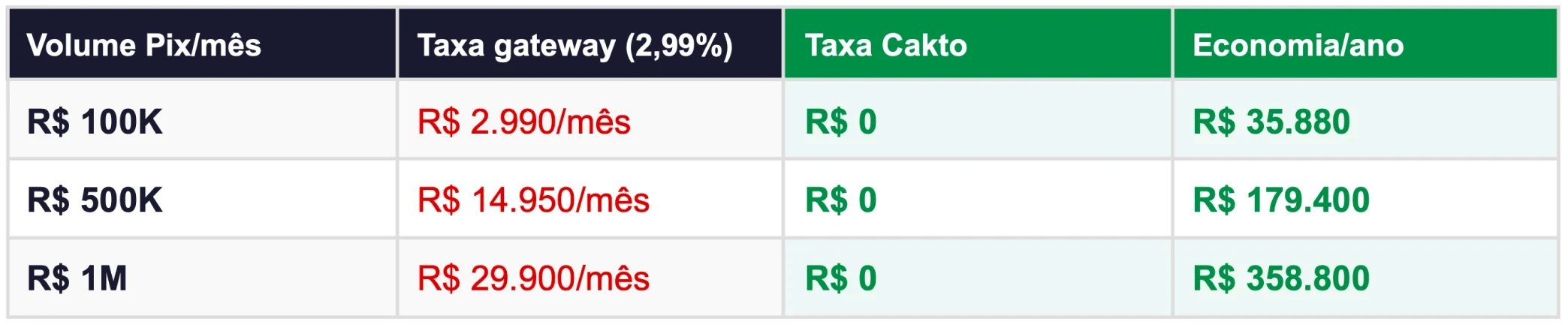 Gateways tradicionais cobram de 0,99% a 3,49% por transação Pix. Na Cakto, Pix é zero. Para um SaaS que processa R$ 500K/mês, isso significa R$ 17.450/mês de economia ou R$ 209.400 por ano.